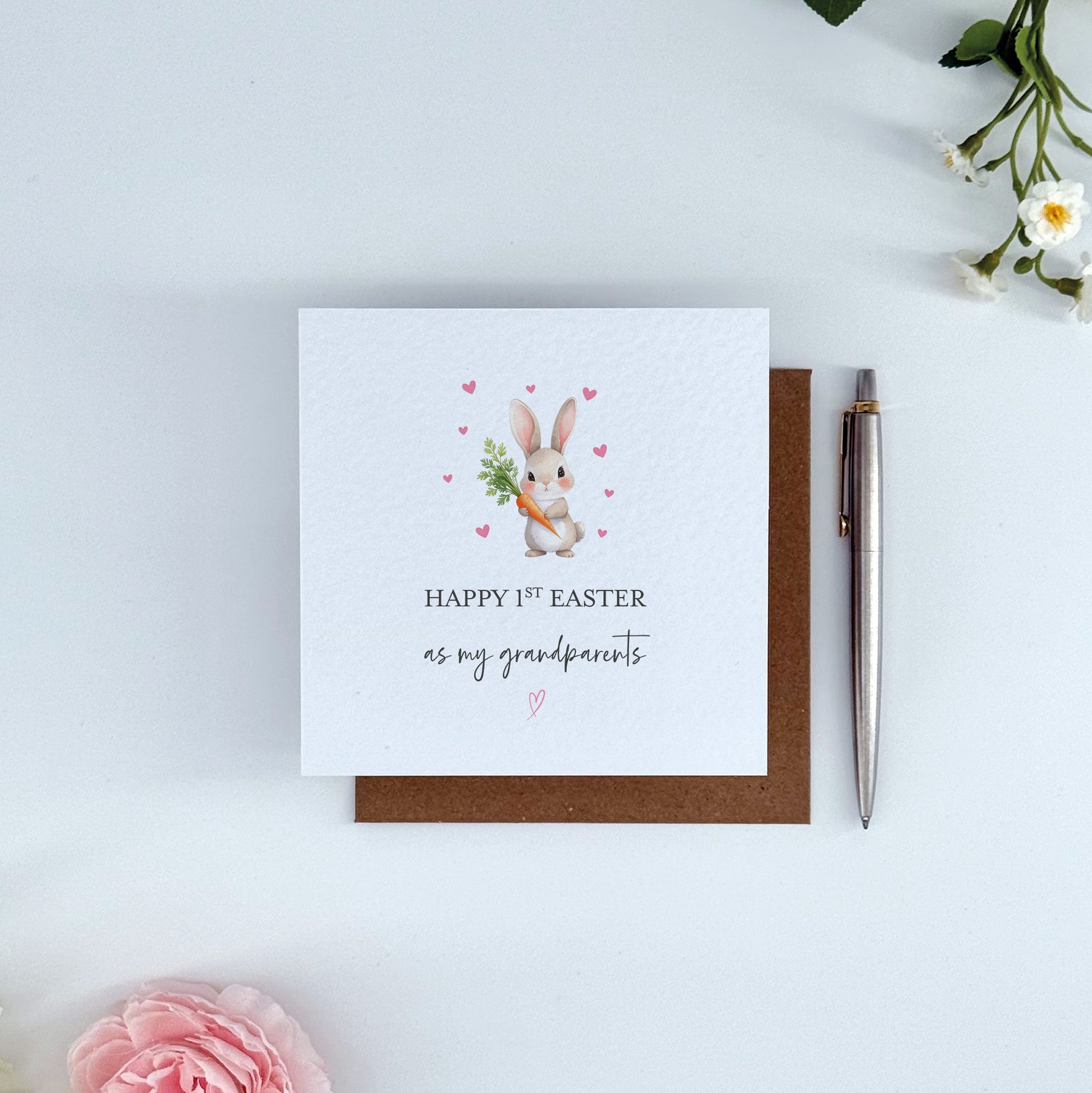 Celebrate a special first Easter as grandparents with this adorable bunny card featuring soft pink hearts surrounding a cartoon bunny holding a carrot. 🐰🩷 This charming Easter card is the perfect way to mark a grandparent’s very first Easter with their grandchild.